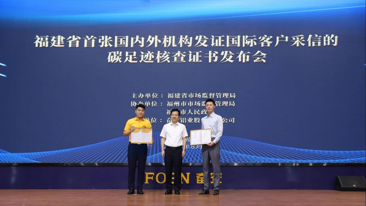 Em 19 de agosto, a FOEN Aluminum Co., Ltd. concedeu oficialmente o primeiro certificado de verificação da pegada de carbono na província de Fujian, emitido por órgãos de certificação nacionais e estrangeiros e reconhecido por clientes internacionais. A cerimônia contou com a presença de Huang Shuimu, Secretário do Grupo de Liderança do Partido e Diretor da Administração de Regulação do Mercado da Província de Fujian; Chen Zongsheng, Secretário do Grupo de Liderança do Partido e Diretor da Administração de Regulação do Mercado de Fuzhou; e Lin Hezhi, Vice-Prefeito da Cidade de Fuqing. Também estiveram presentes Huang Fen, Presidente da FOEN Aluminum Co., Ltd., além de funcionários relevantes dos departamentos provinciais de regulamentação do mercado e do Instituto Provincial de Metrologia de Fujian, representantes do Grupo de Certificação da Marca de Qualidade da China e da Intertek Testing Services (Shanghai) Co., Ltd.